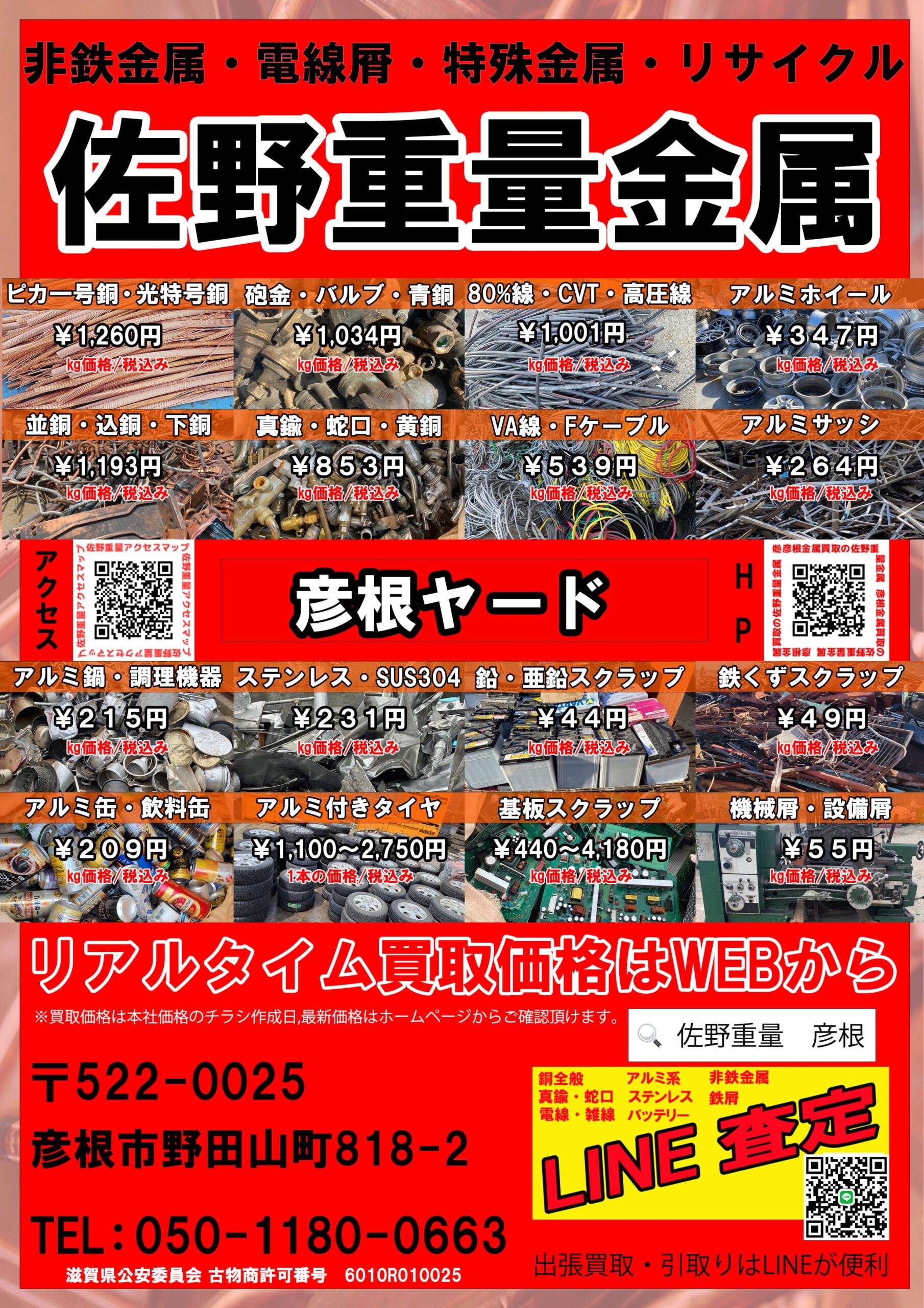 また、金属スクラップの買取価格につきましては、ホームページで買取価格をご確認頂くか、お電話にて直接お問合せ頂ければ最新の買取価格をお伝え出来ます。