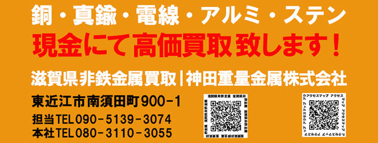 また、滋賀県全域で非鉄金属の出張買取とお持込みヤードがございます。お気軽にご相談ください。